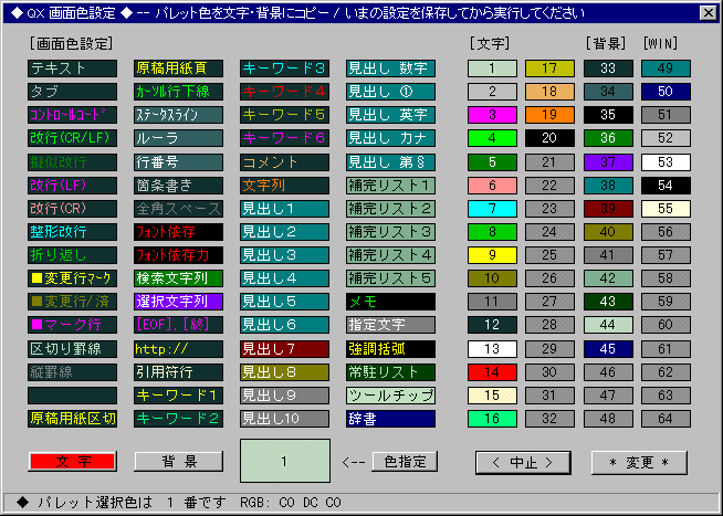【 制限 】2000年7月30日評価版以前のQXでは、マクロで色設定を変更しても、その後QXを終了したときに色設定が保存されないようです。それ以前のバージョンをお使いのときは、設定した色をさらに「共通設定」−「色」の「書込み」で保存して、またQXを起動したときに読込むなどして使ってください。読込んだ色設定のままでQXを終了すると、こんどは設定が保存されます。